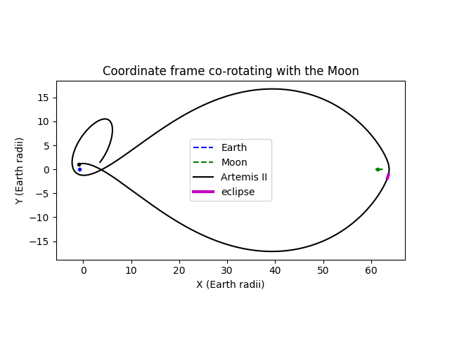 Visualization of the Artemis II trajectory with the eclipse highlighted.#